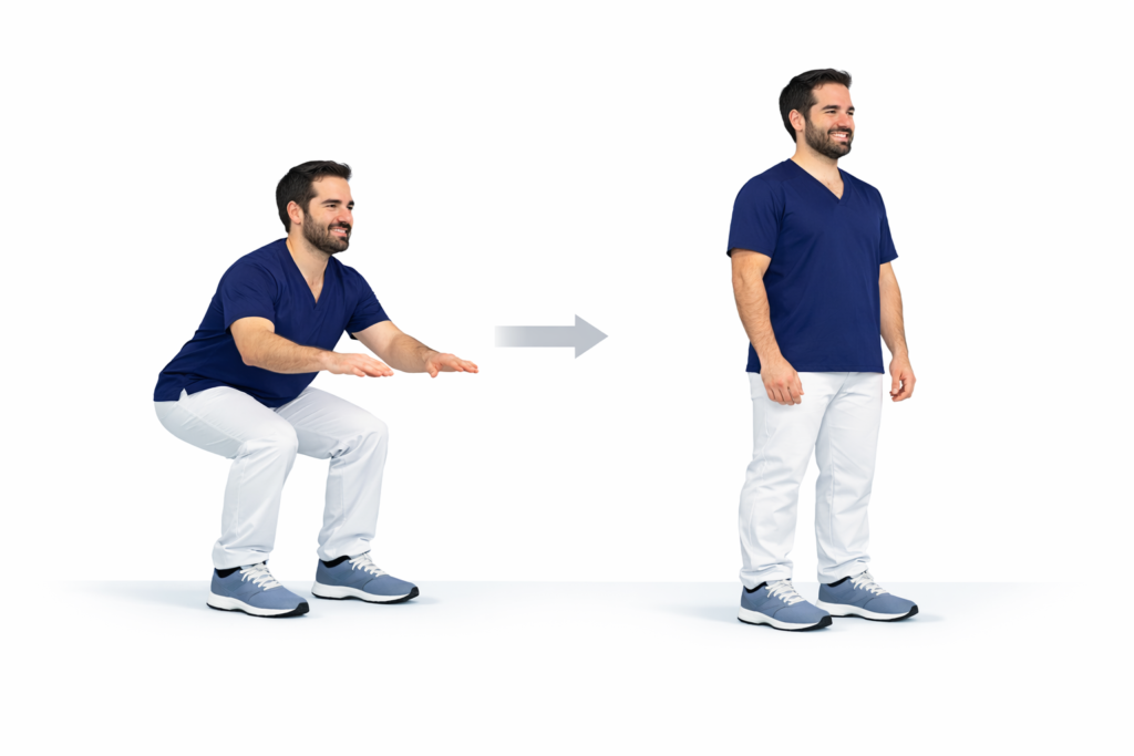 Setzen Sie sich auf einen stabilen Stuhl und stehen Sie langsam auf. Danach setzen Sie sich wieder kontrolliert hin.